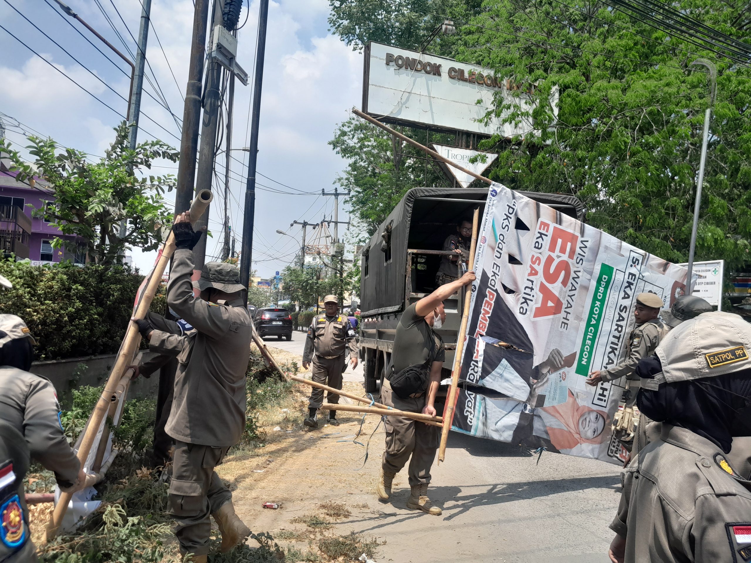 CILEGON, LINTASBANTEN.COM- Dinas Satuan Polisi Pamong Praja (Satpol-PP) Kota Cilegon melakukan penertiban Alat Peraga Kampanye (APK) dan Alat Peraga Sosialisasi (APS) sepanjang jalan protokol, Rabu 4 Oktober 2023.